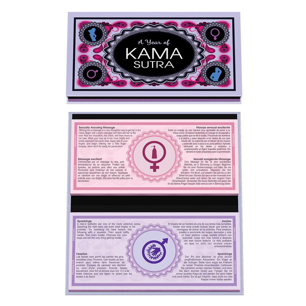 Kama Sutra - Izaberite kartu sa savetima svake nedelje koju ćete podeliti sa svojim voljenim/voljenom. Naizmenično koristite tehnike „Za njega“ i „Za nju“. Počnite sa predigrom i senzualnim tehnikama i pređite na kreativnije i izazovnije tehnike vođenja ljubavi kako godina bude odmicala. Rezultati su apsolutno orgazmatični. Sadrži: 26 karata sa savetima za seks za višekratnu upotrebu za njega i 26 karata sa savetima za seks za višekratnu upotrebu za nju.
